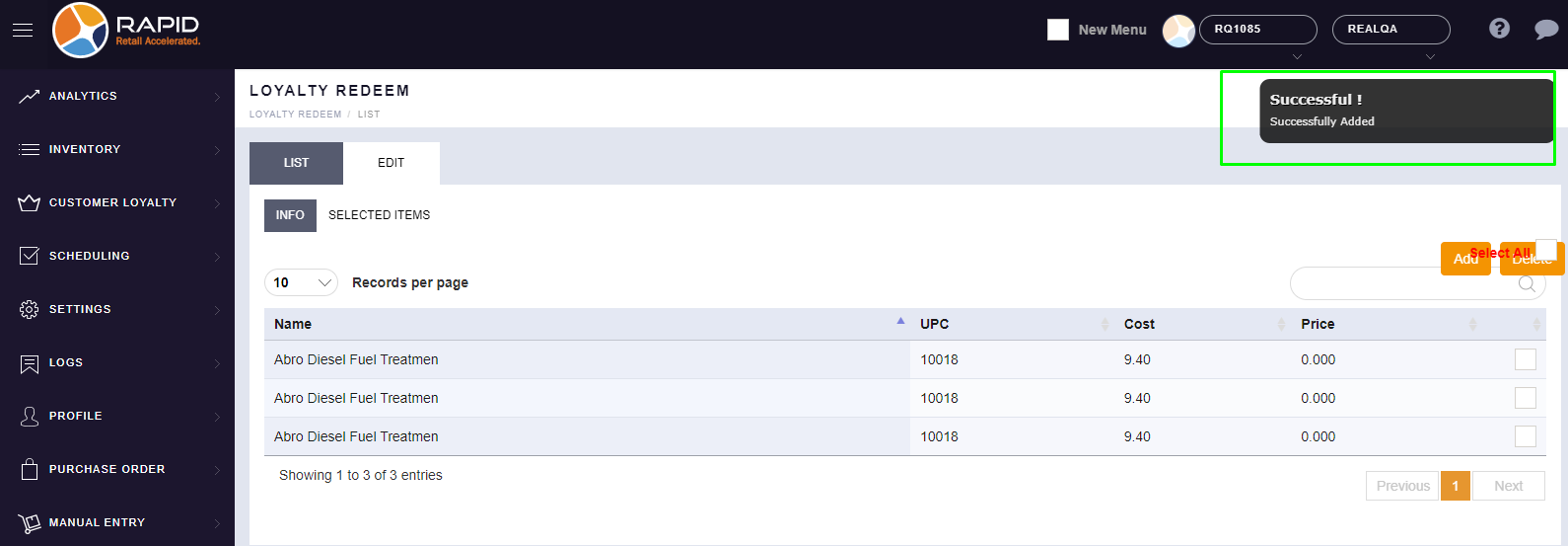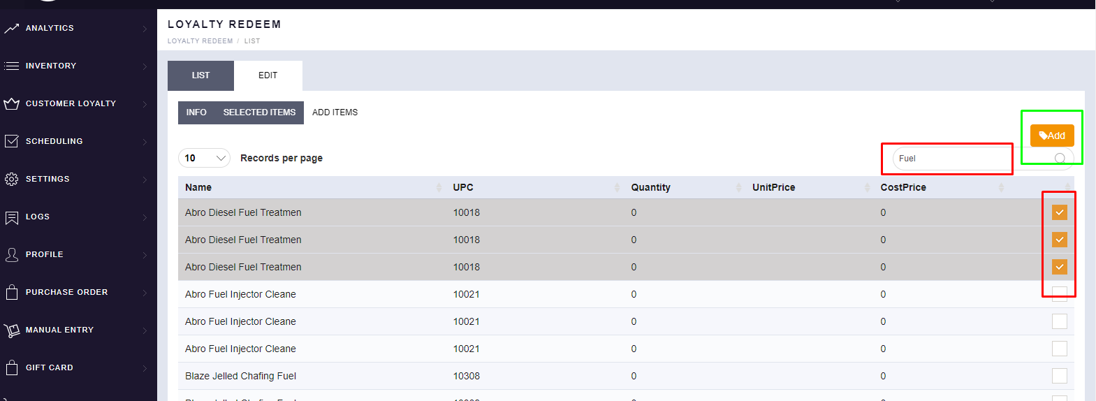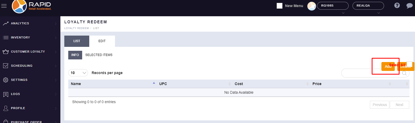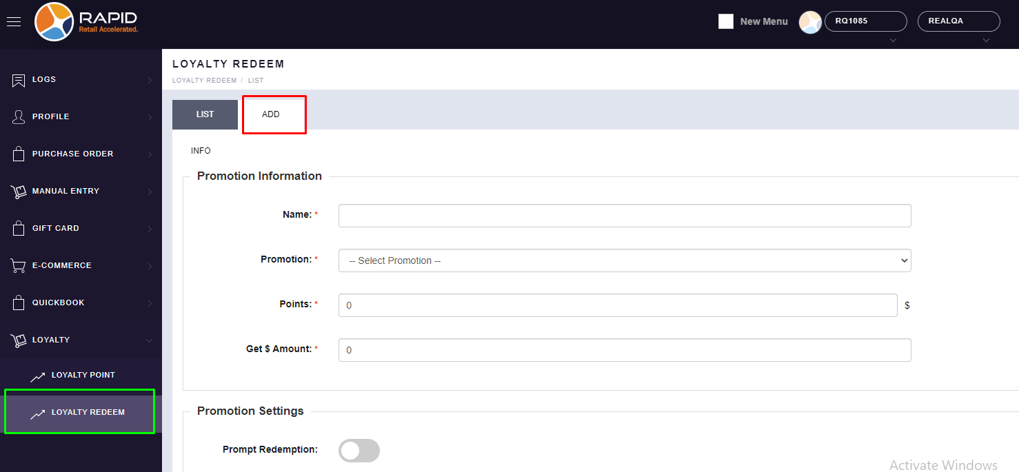 - 3. You will find the “LOYALTY REDEEM” option, click on it and you can click on the “ADD” section.