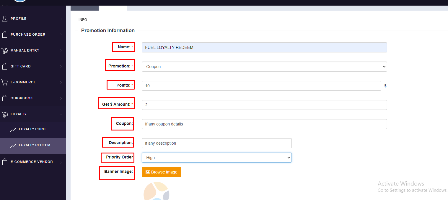 ● Promotion: You can choose your Promotion Type from here. (For Example : Fuel)