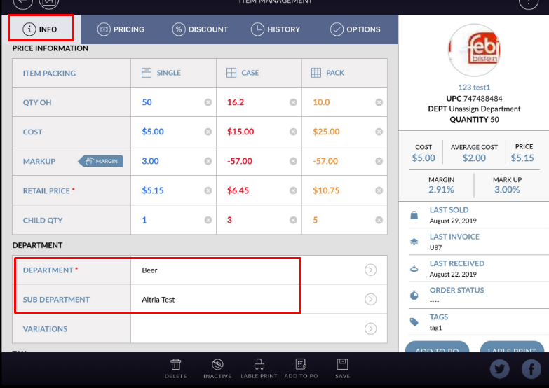 - In the top of the screen, it has Info, Pricing, Discount, History and Options tabs.