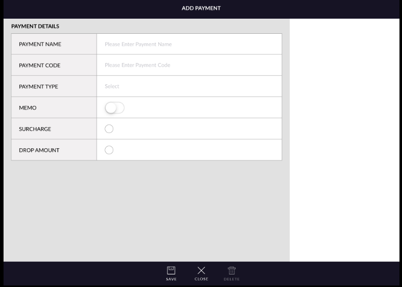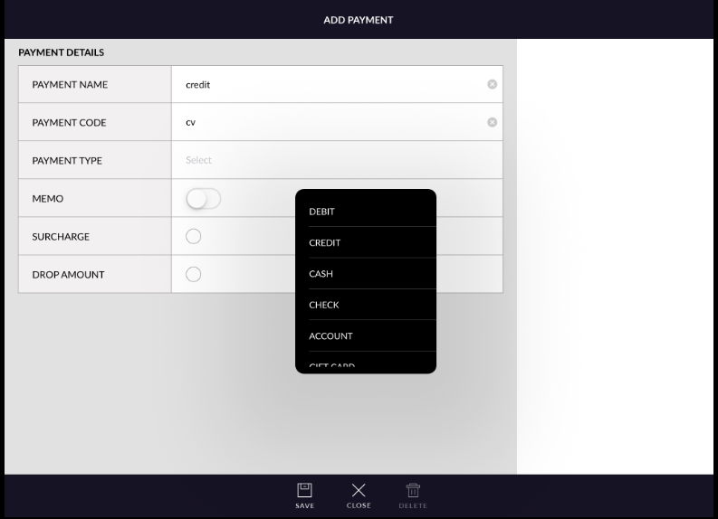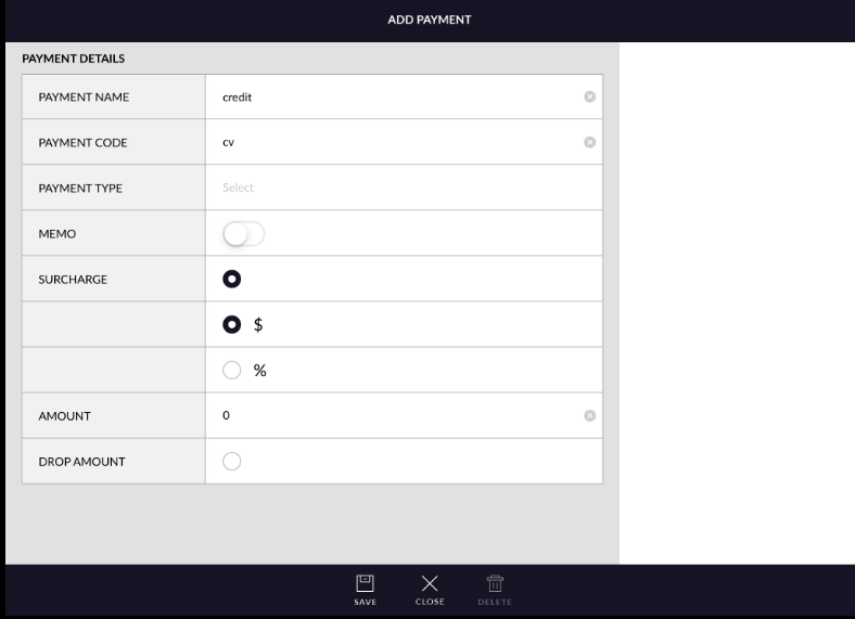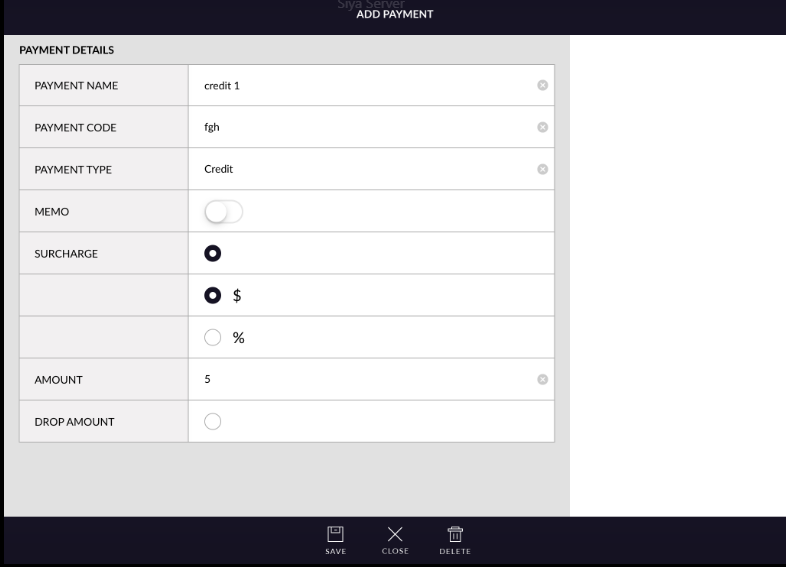 - Drop amount: Only select drop amount for a particular method if you want to take cash out from the drawer. If the drop amount is selected then any amount charged will be in a negative value.