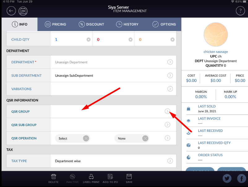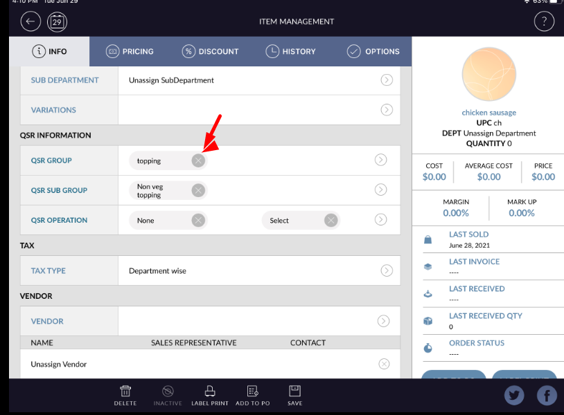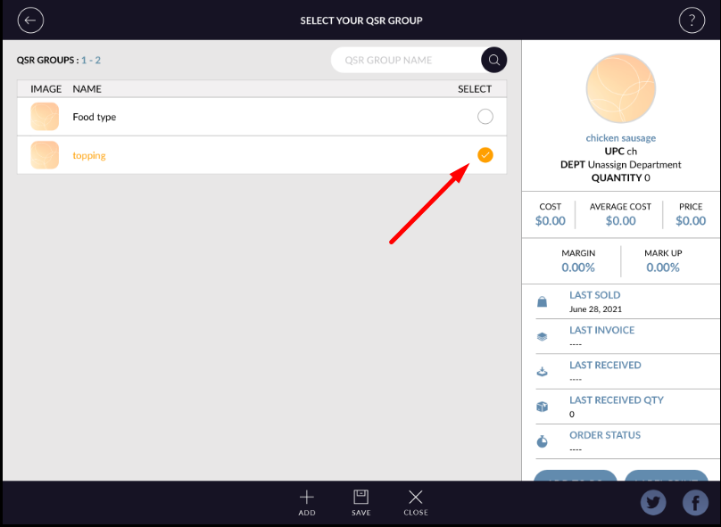 - Hit save button, qsr group will be added to item.