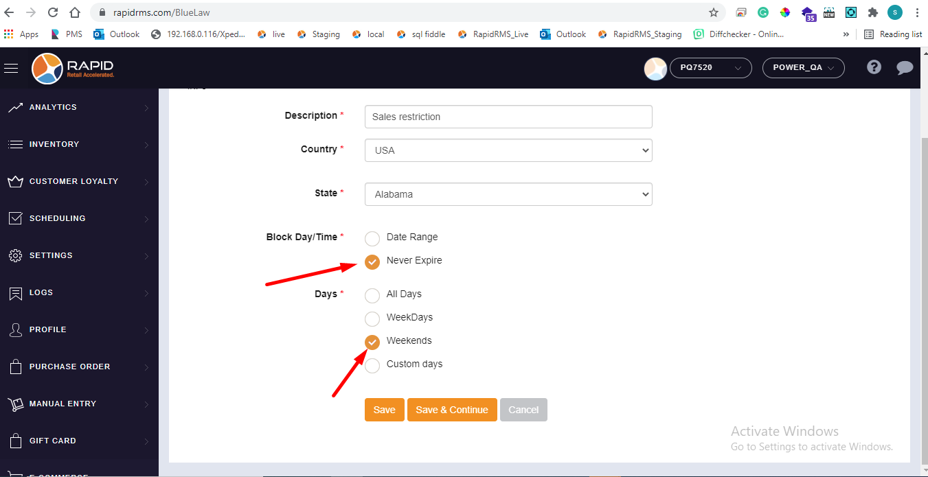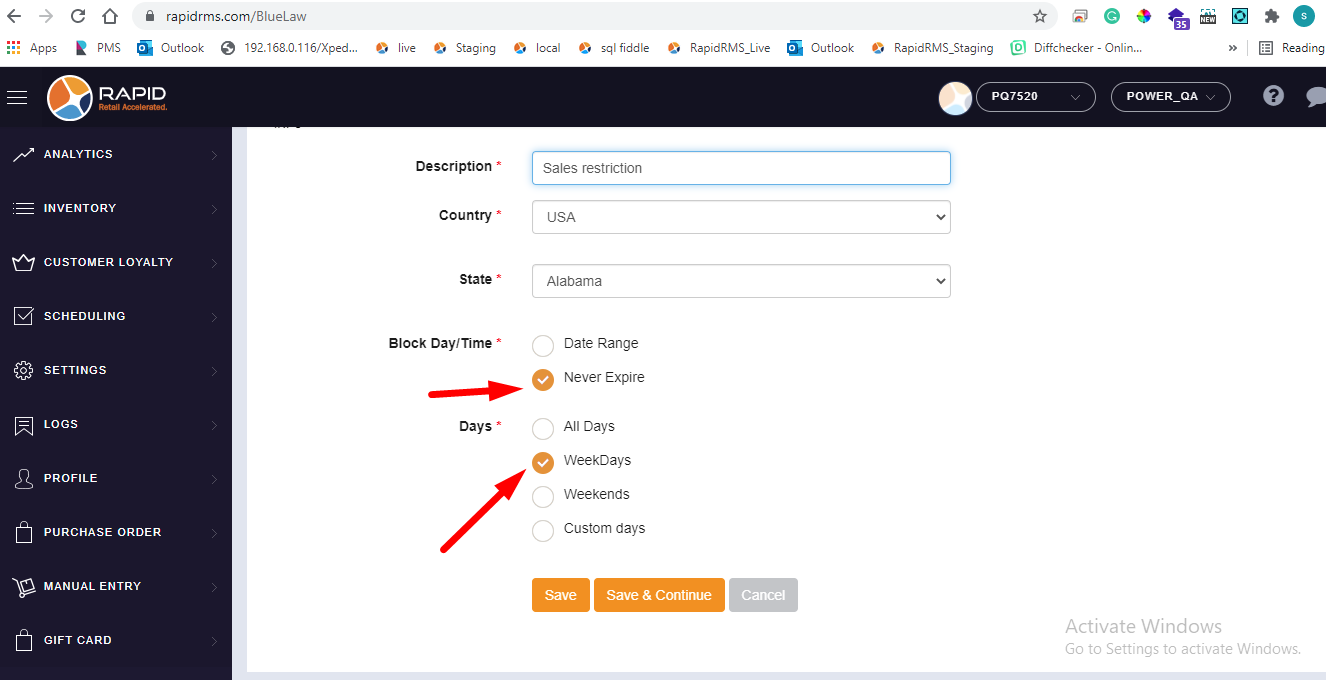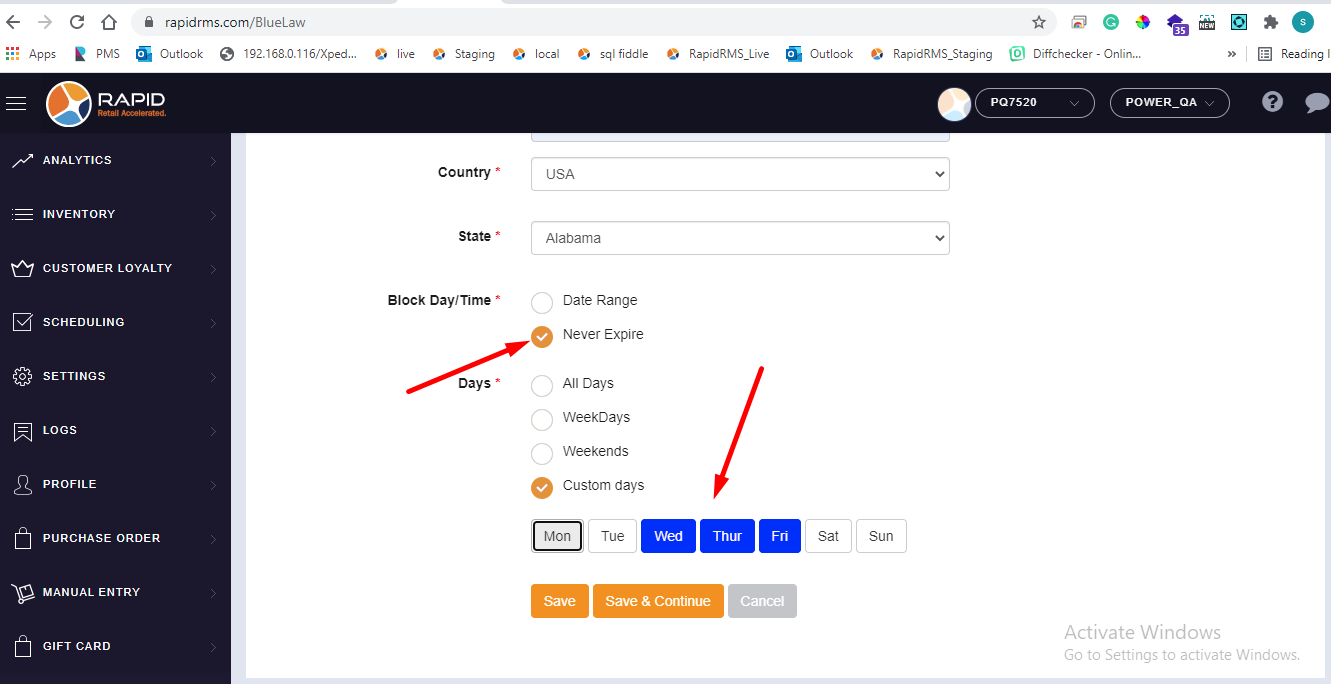 - If all days selection is available for never expire that meas item can never be sold till it is configured in blue law entry.
