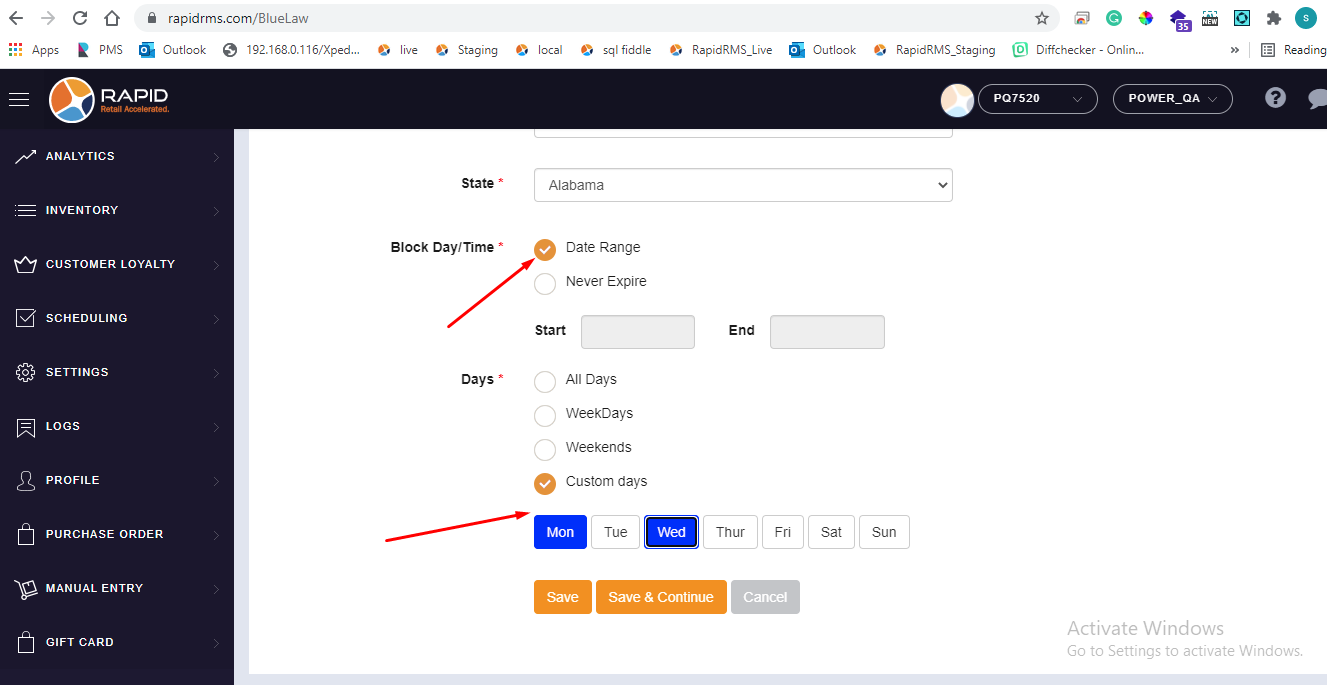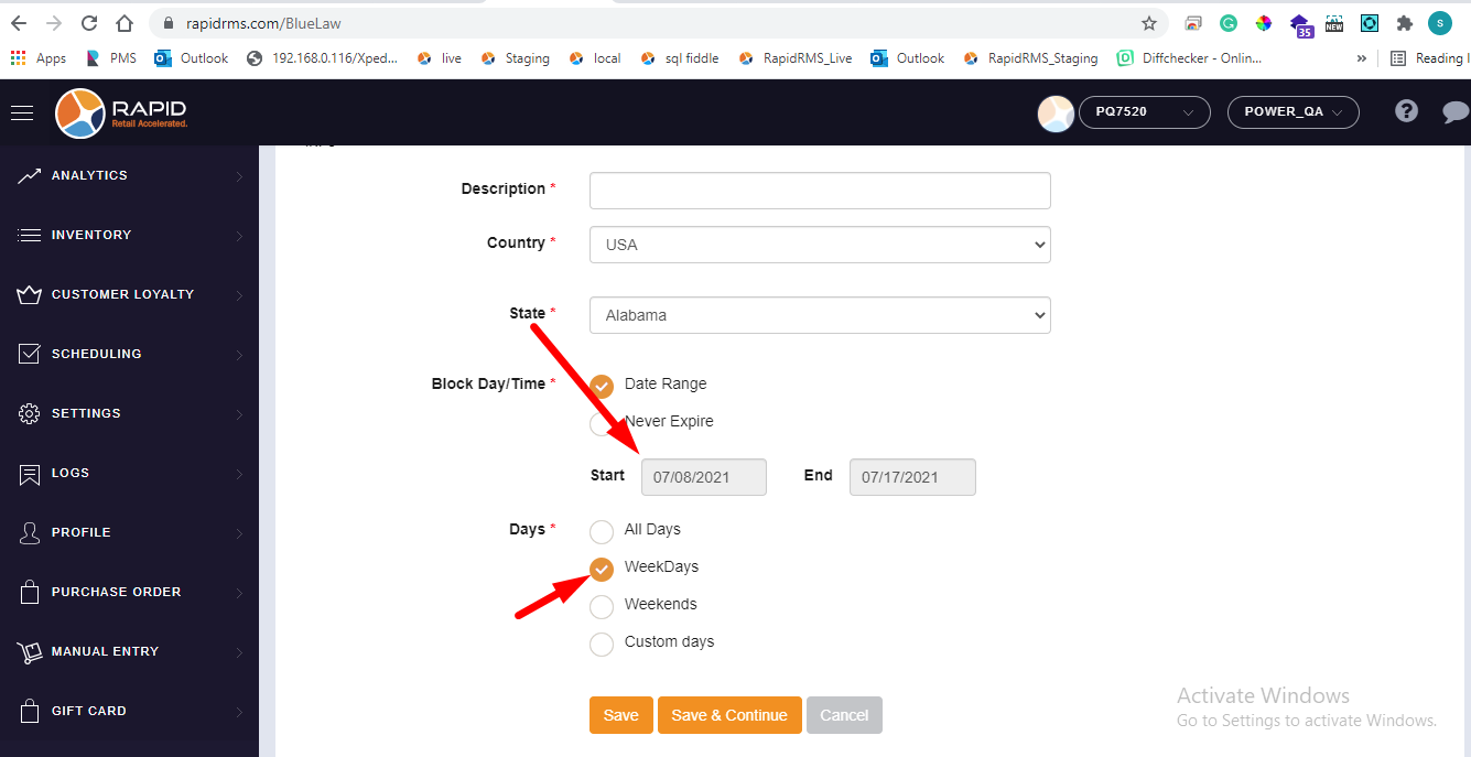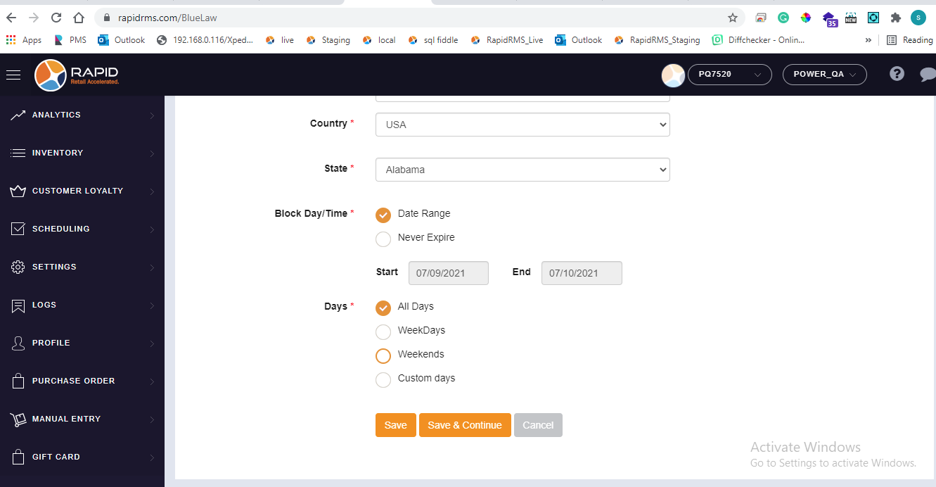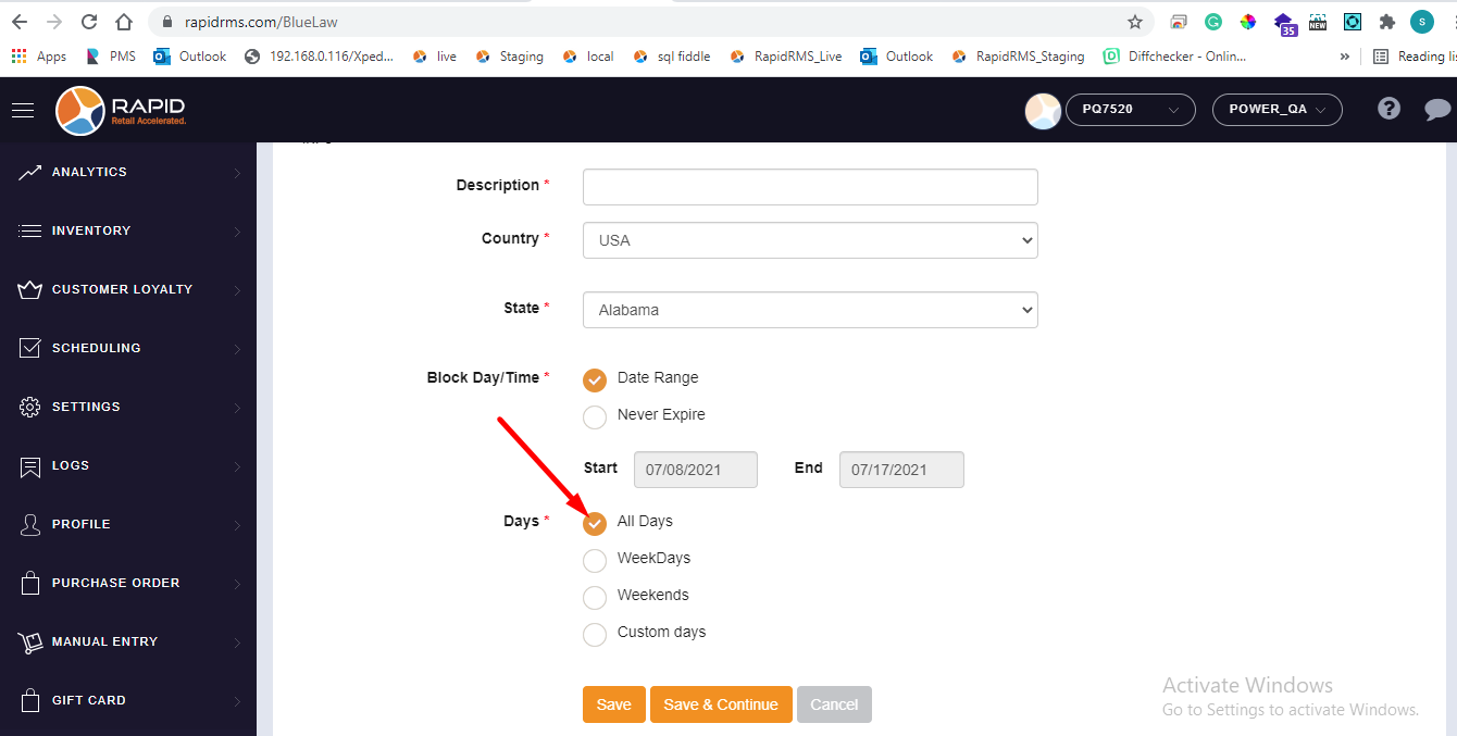 - If all days selection is available for never expire that meas item can never be sold till it is configured in blue law entry.