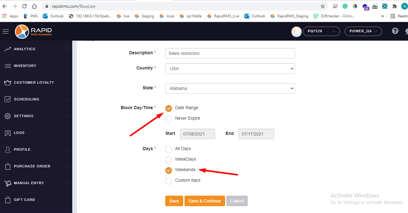 - If all days selection is available that means from date range selection all the days configured item is for sales restriction.