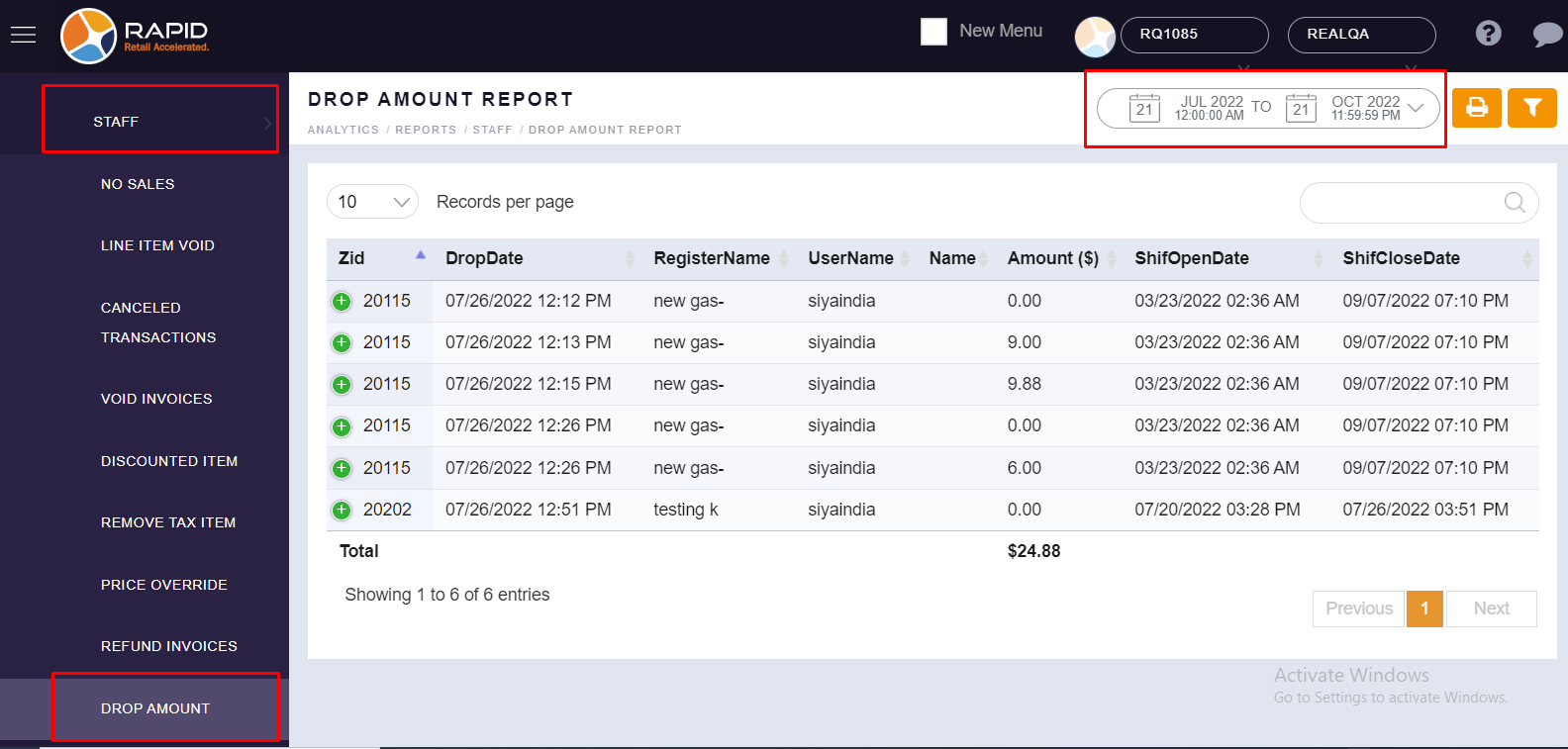 - In Staff, you will find the “DROP AMOUNT” option, here you can select date range as per your required
