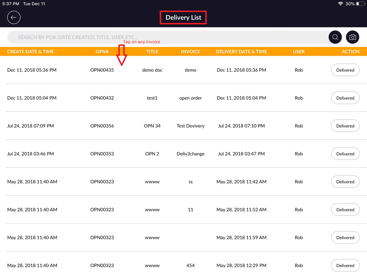 - Orders will display with created date & time,OPN#, title, invoice, receiving date & time, user and Action.