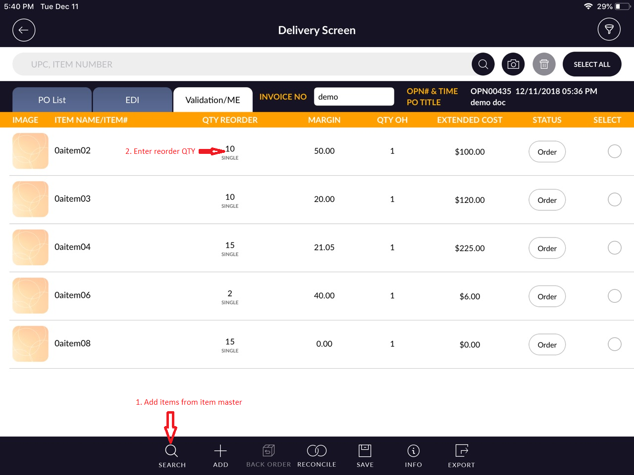 - At there, Scan or add items which store ordered and enter ‘Qty Reorder’.
