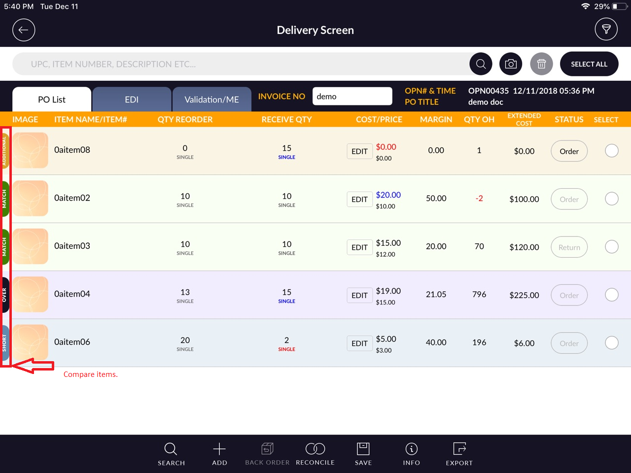 - Now go to PO list and compare items.