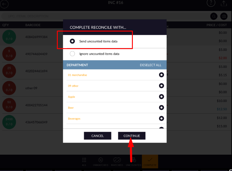 - When you select “send uncounted data” then popup display for select/unselect department.