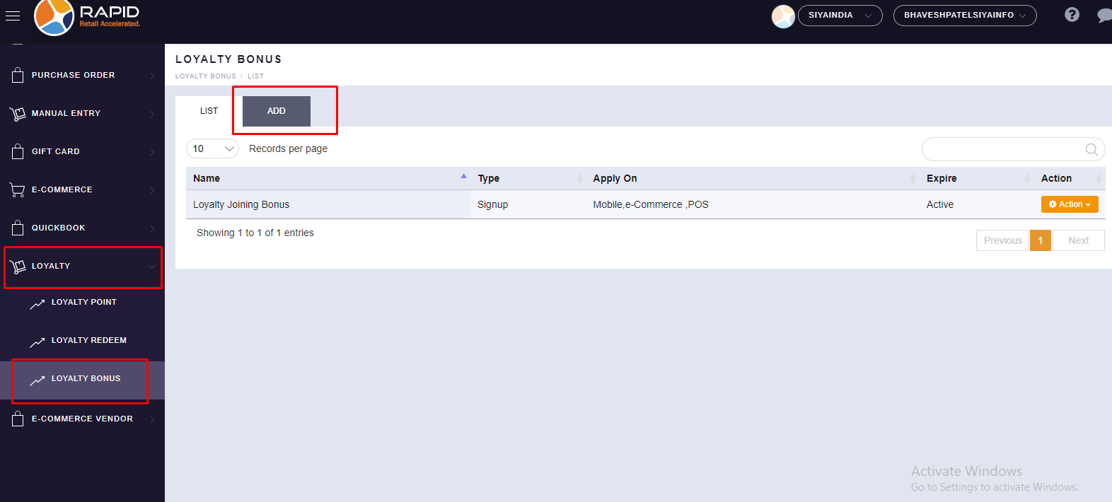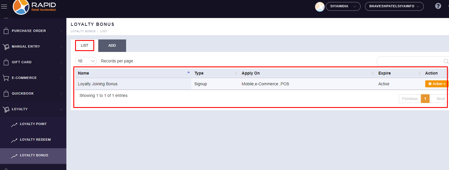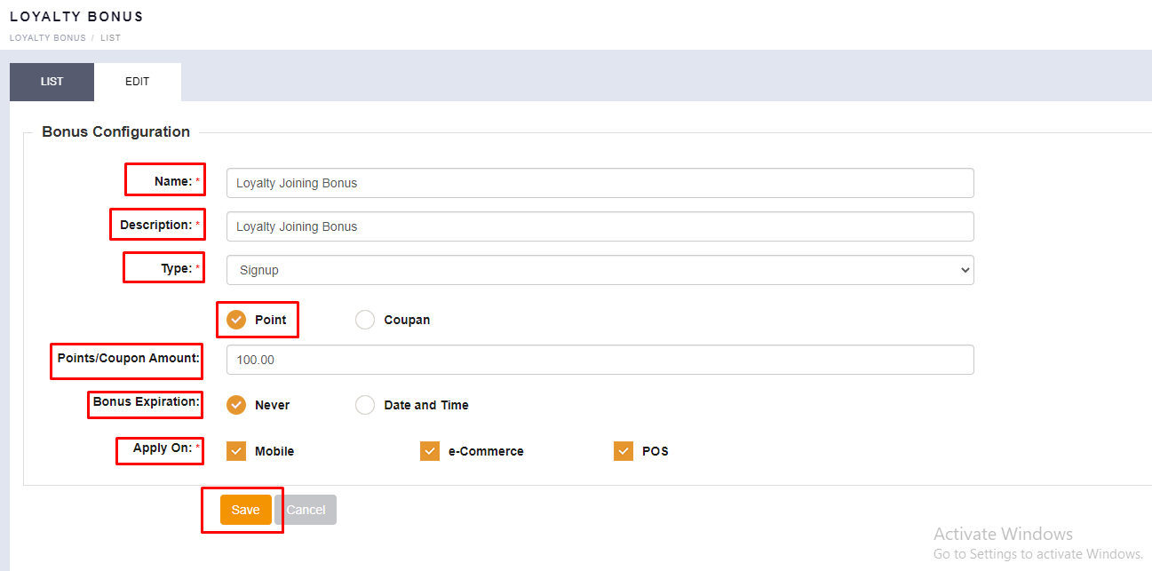 SAVE ” button. - Your created Loyalty Bonus will be displayed in the List option.