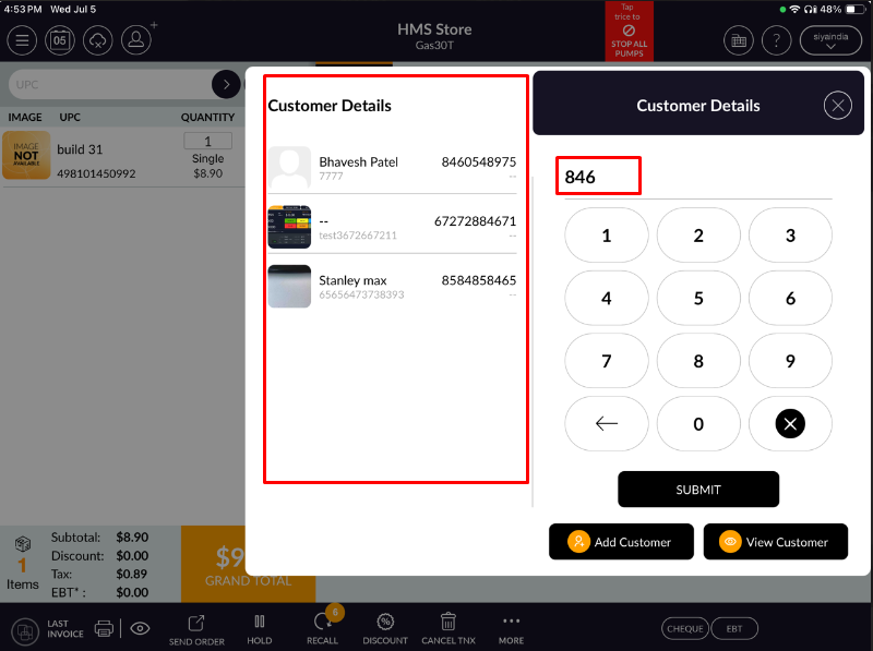 - Click on the “Customer Add” option, which is available at the top of the bill.
