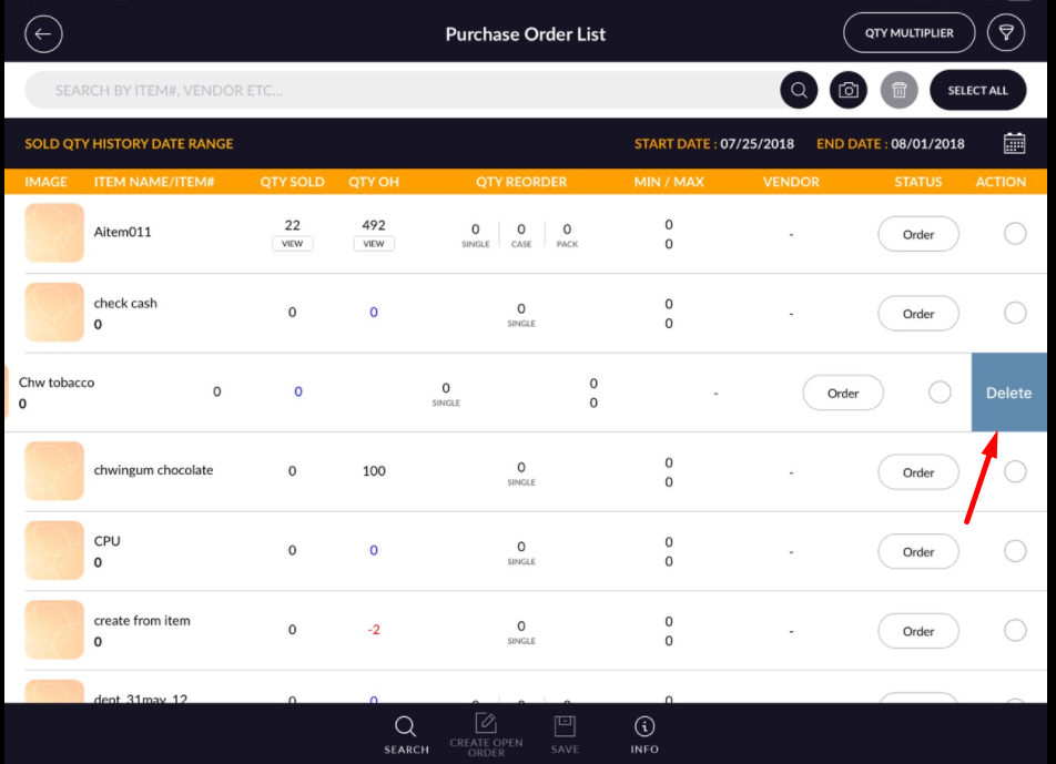 Items can be deleted till they are in either purchase order list, open order or delivery pending list.
