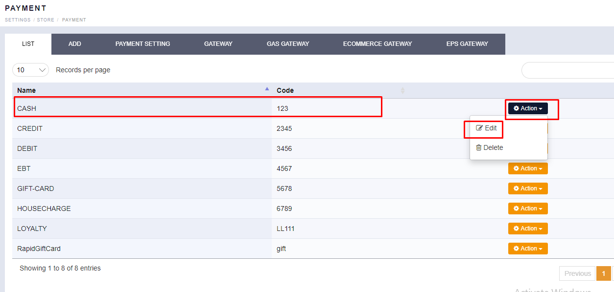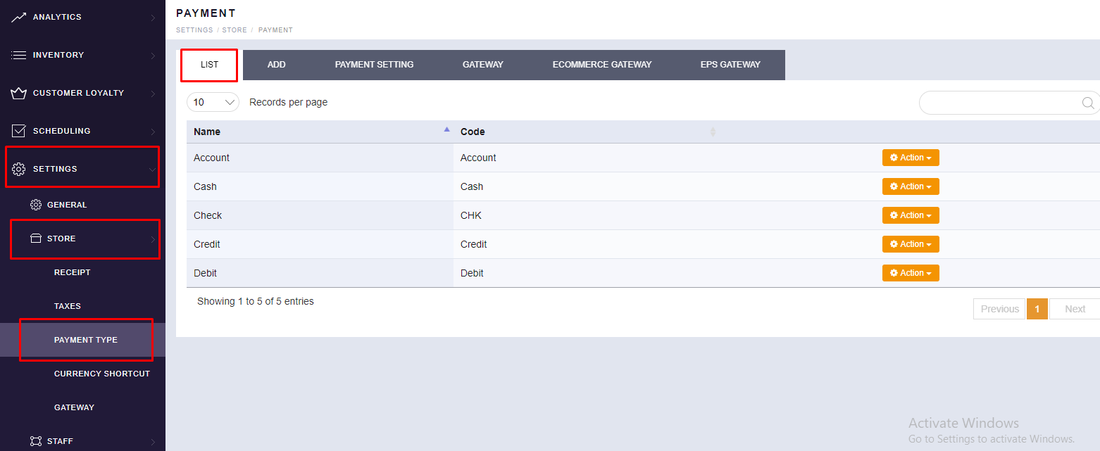 - Scroll to see the “PAYMENT TYPE” option. You will find your existing list of Tender.