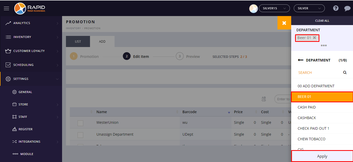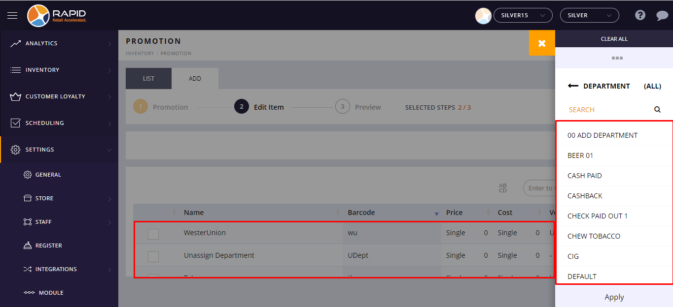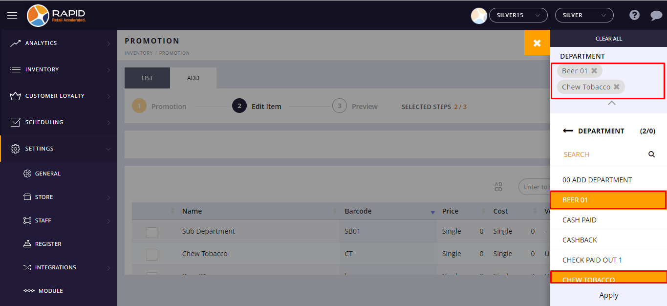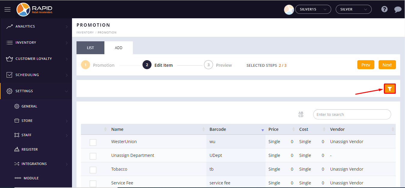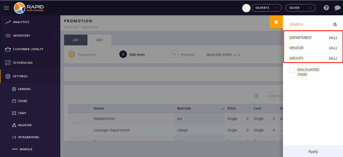 - You can filter items Department wise, Vendor wise, and Group wise.