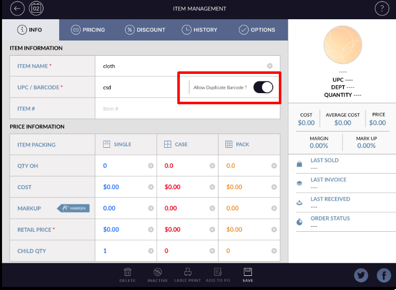When barcode button is set to ON, you can add duplicate barcode in item. It is possible to add multiple time duplicate barcode.