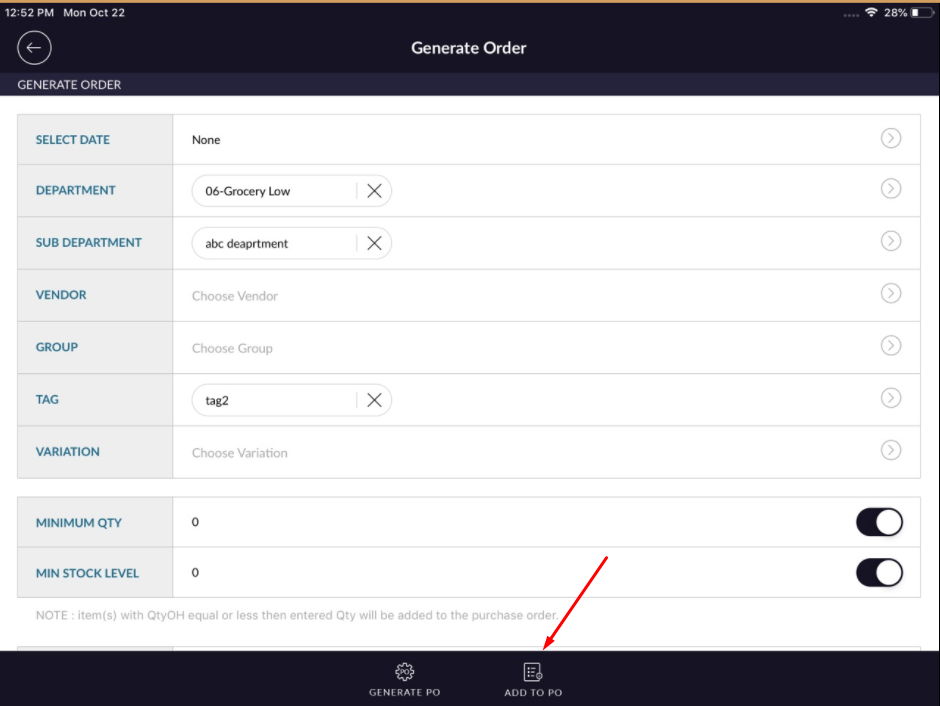 - Item can be filtered via, department, vendor, group, tag, variation, min qty, maximum stock level etc.