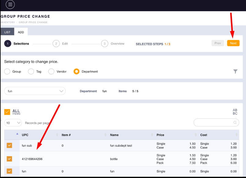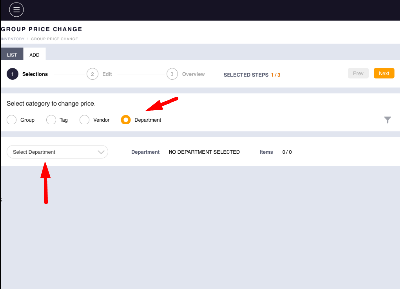 - Let suppose you want to change the price of any department’s item then select the radio button of the department.