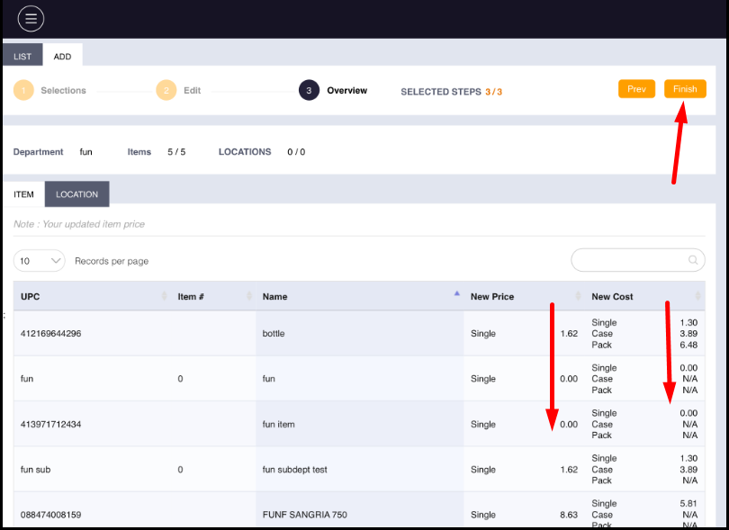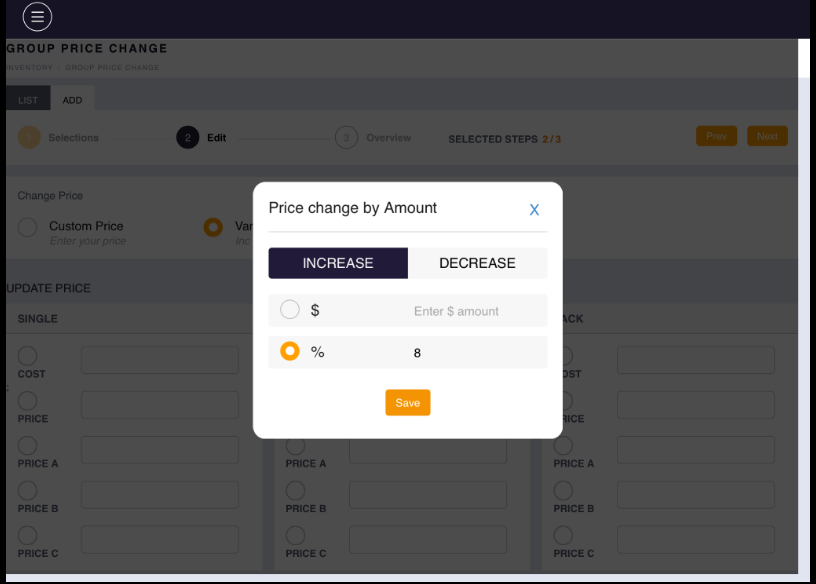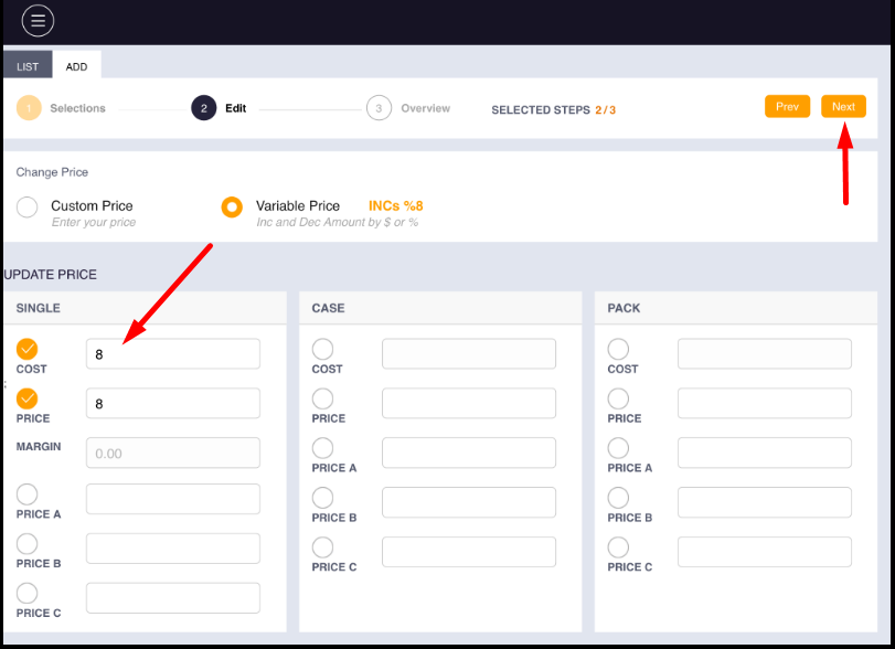 - Custom price: When you select custom price option then the cost and price of single, case and pack can be the change of selected items.