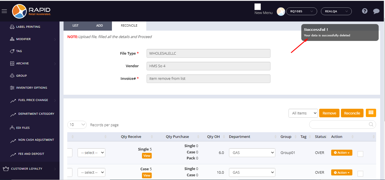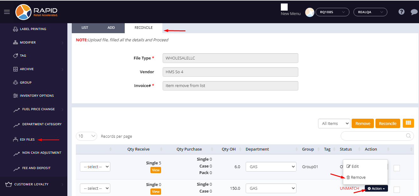 After Imported items from EDI File if a store wants to delete any one particular item then they can do it by