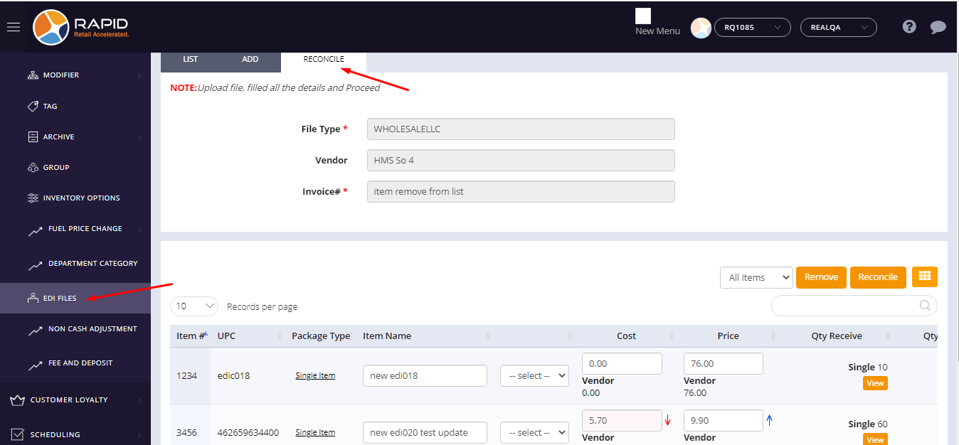 - After importing the EDI file, the page would be redirected to the reconcile page.