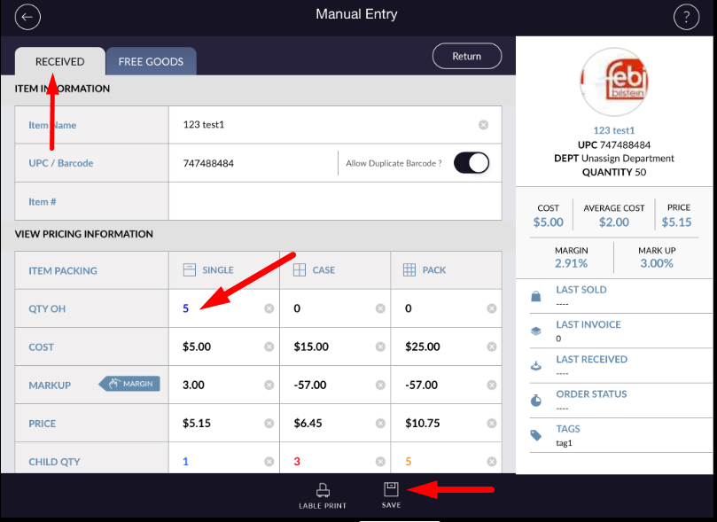 Field Description Received It allows you to enter the received quantity of an item. Free Goods When you get free items with the purchased item. - It will open the Received tab.