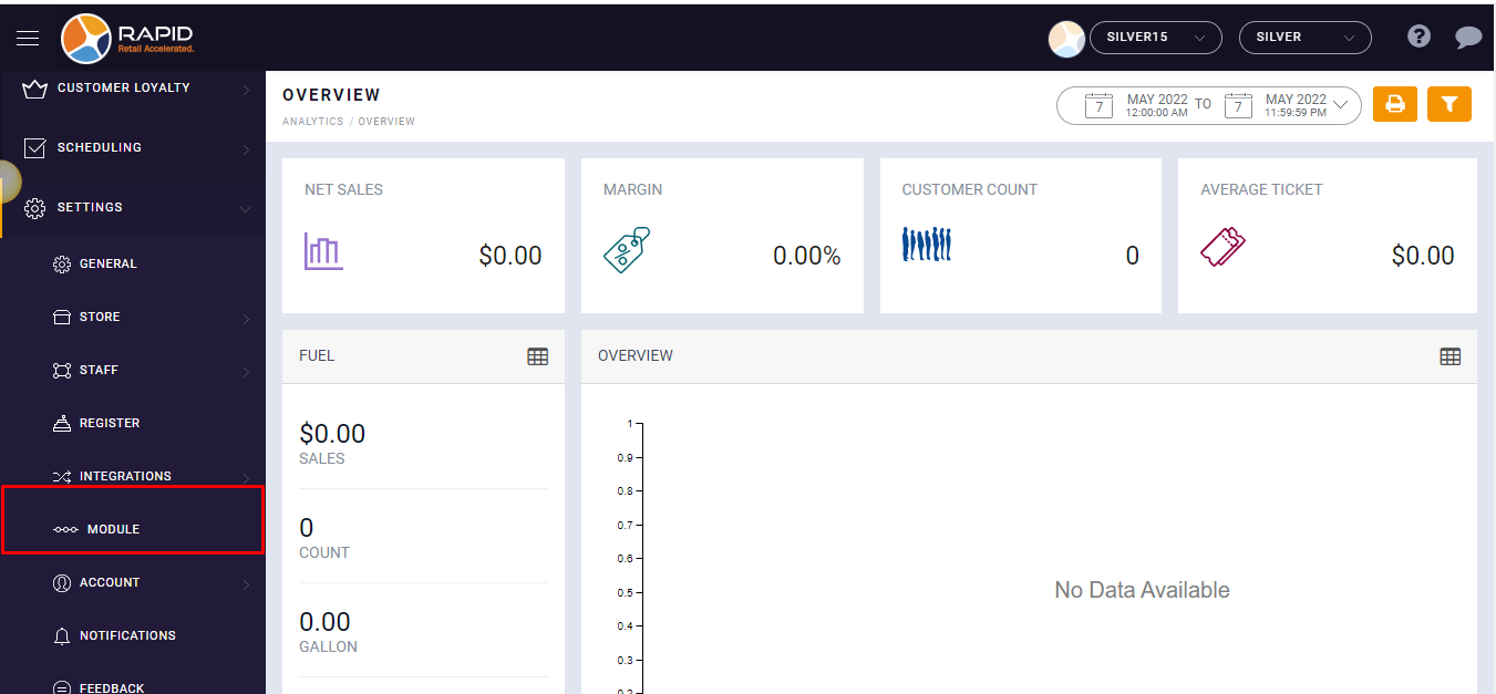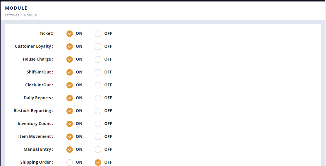 - Now select ON/OFF radio button to turn on or turn off the modules from Back office.
