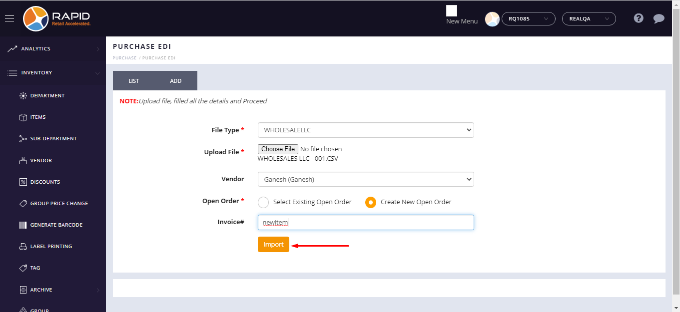 - Before doing the EDI file import process, under EDI file add new item with other compulsory fields.