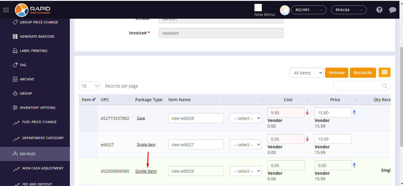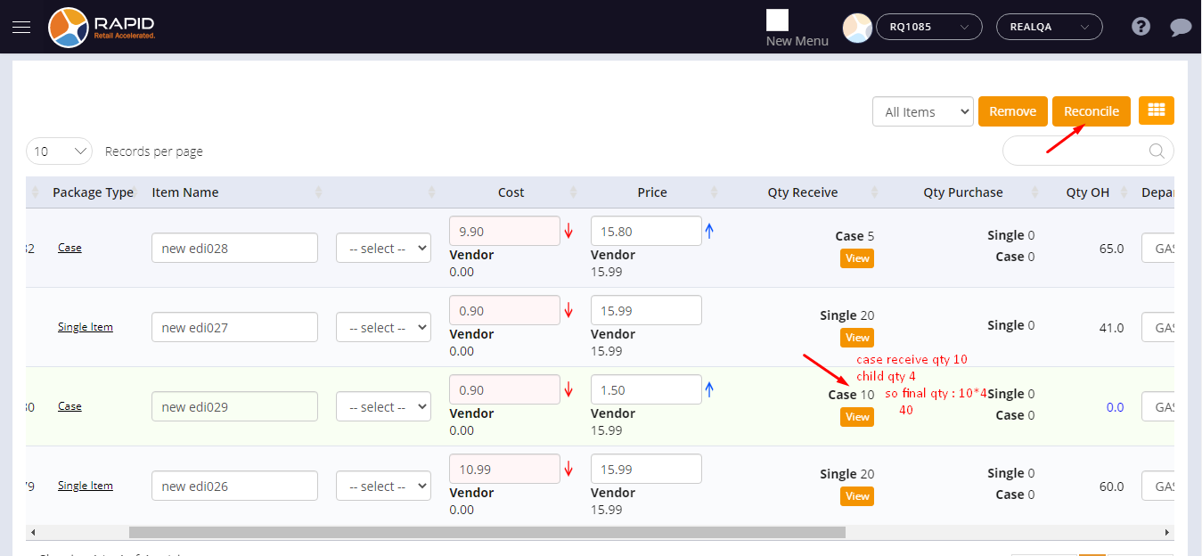 - EDI receive qty would be displayed under the reconcile page -> qty receive column with selected package type (case).