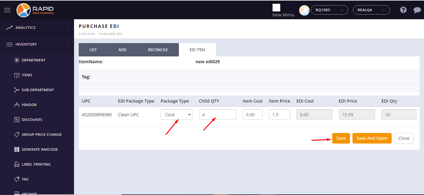 - In Edi item page, select package type (case) and enter child qty if selected package type is single then child qty would be non editable mode with 1 qty.