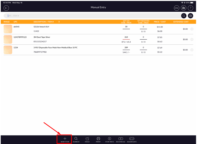 After you create a new invoice from manual entry, you will need to click on new item button from the bottom bar to create a new item.