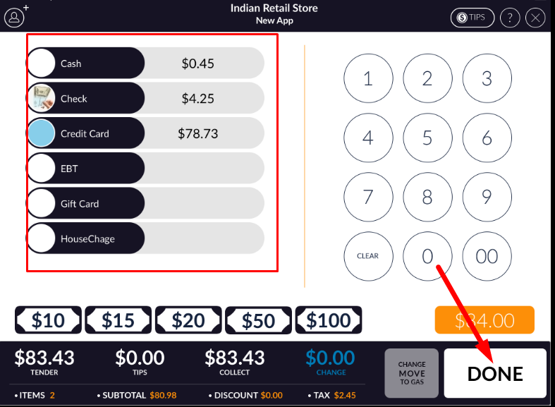 - There are payment types available like cash, check, credit, EBT, Gift card, House Charge, or any other which are set from payment master.