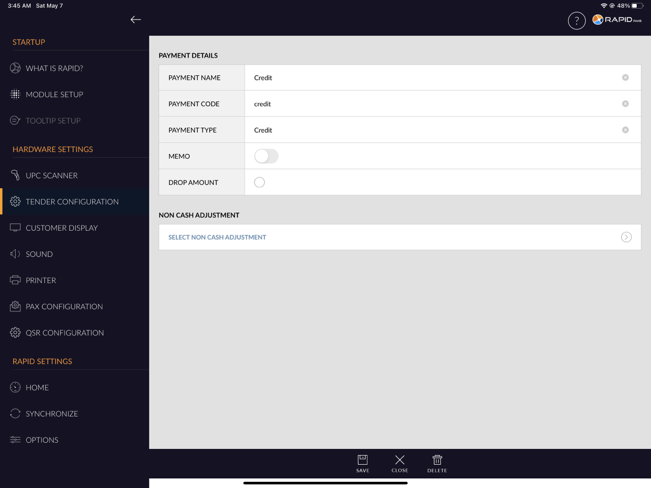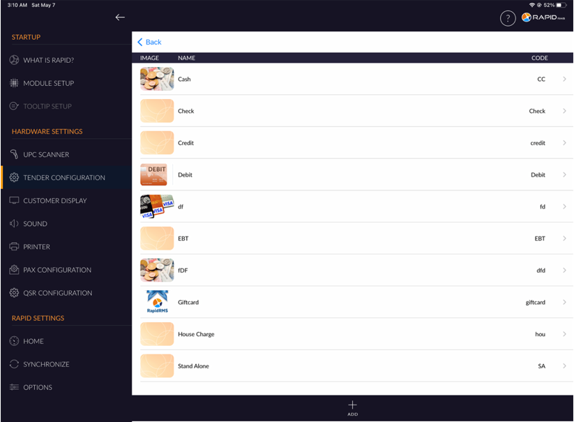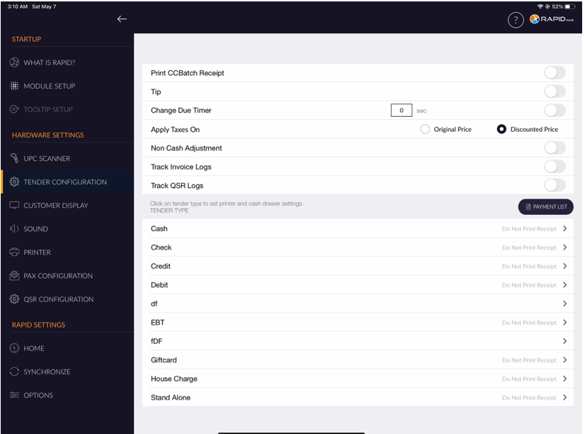 - Select the Tender configuration option from the right side menu.