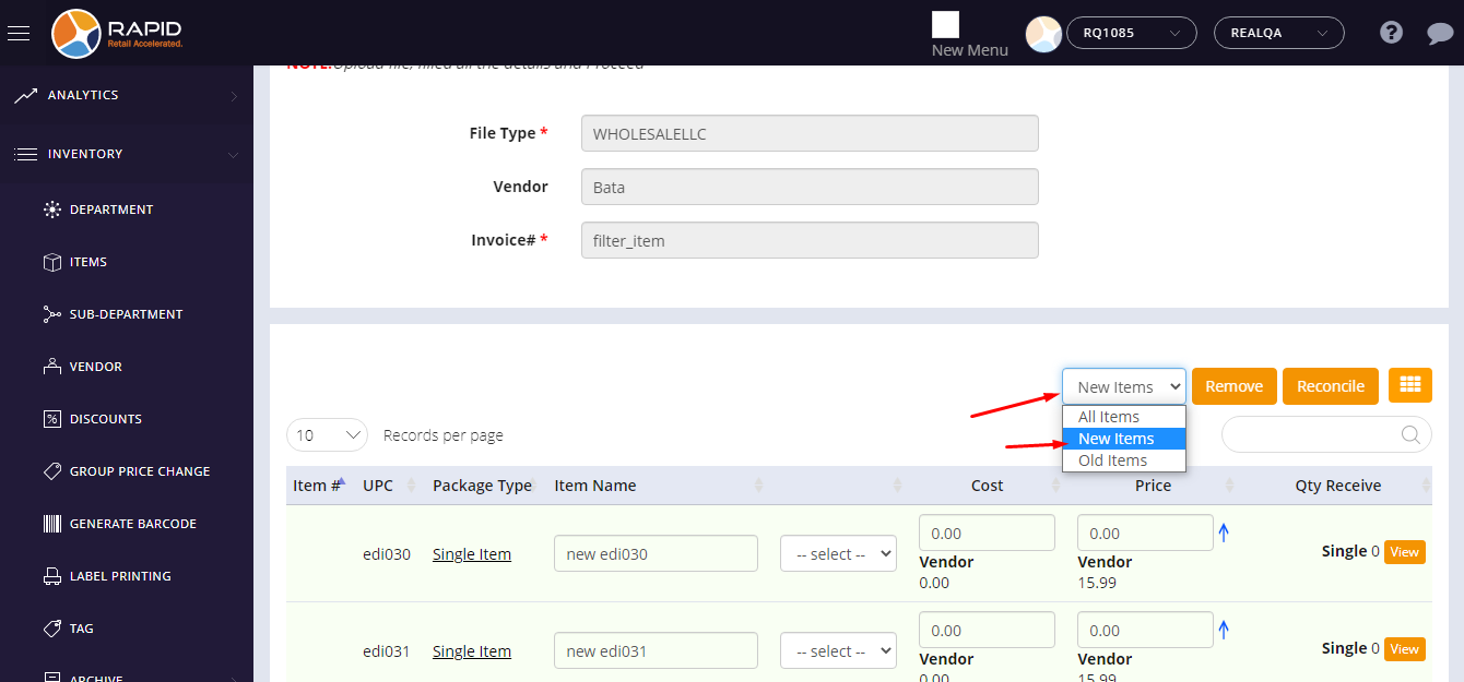 - After import, the page will redirect on the reconcile and imported EDI file’s data would be displayed there.