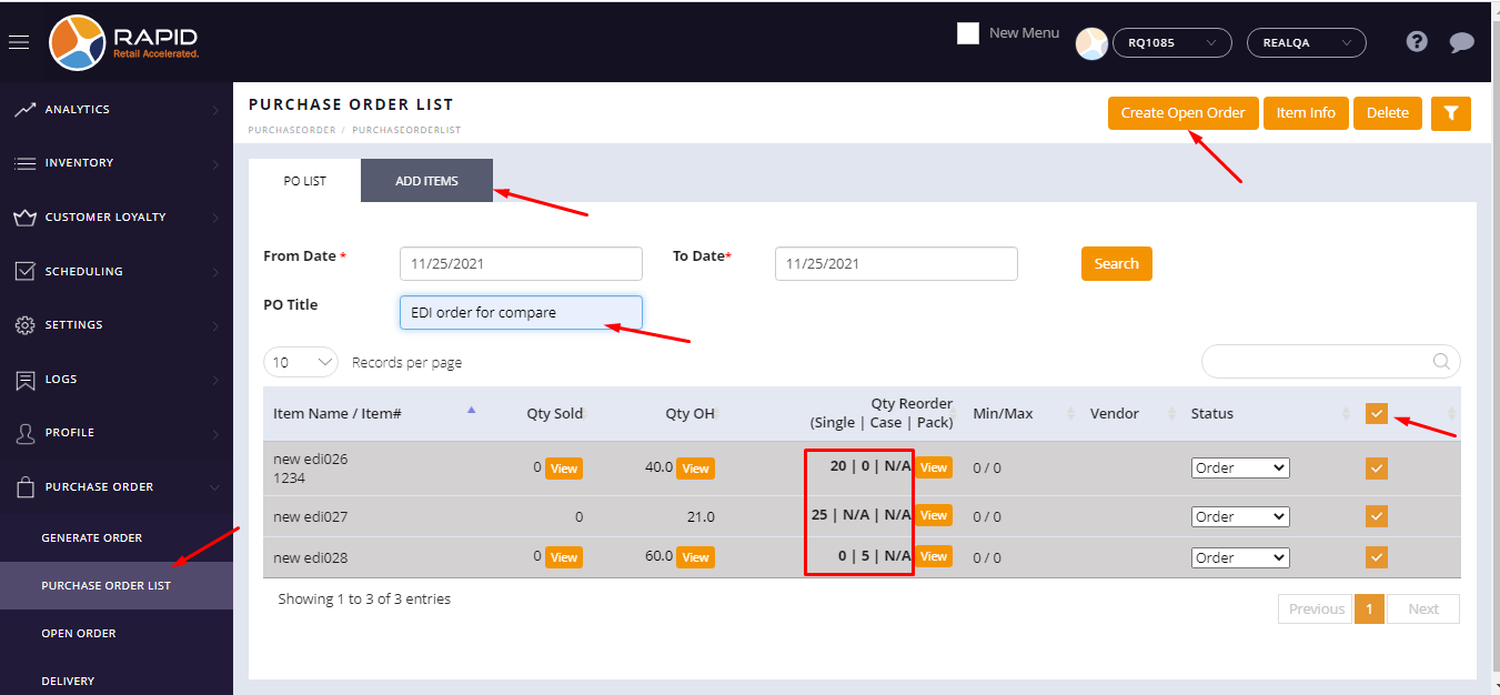 - Purchase order -> Purchase order list -> Add items -> Add Qty Reorder -> enter Po title ->select items
