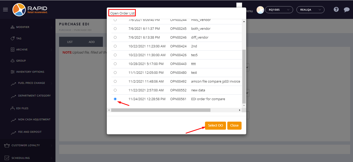 - Select the order which was created in above point and click on ‘Select OO’ button.