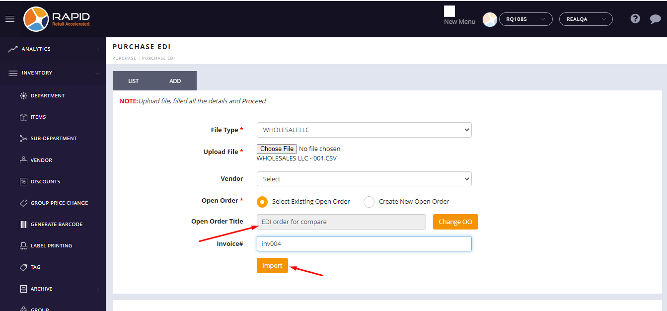 - Enter Invoice# and click on the ‘Import’ button.