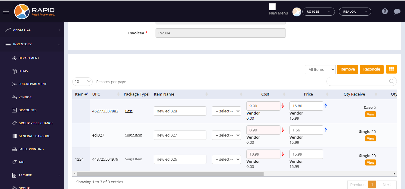 - EDI file would be imported and page redirects on the reconcile page with EDI file data.