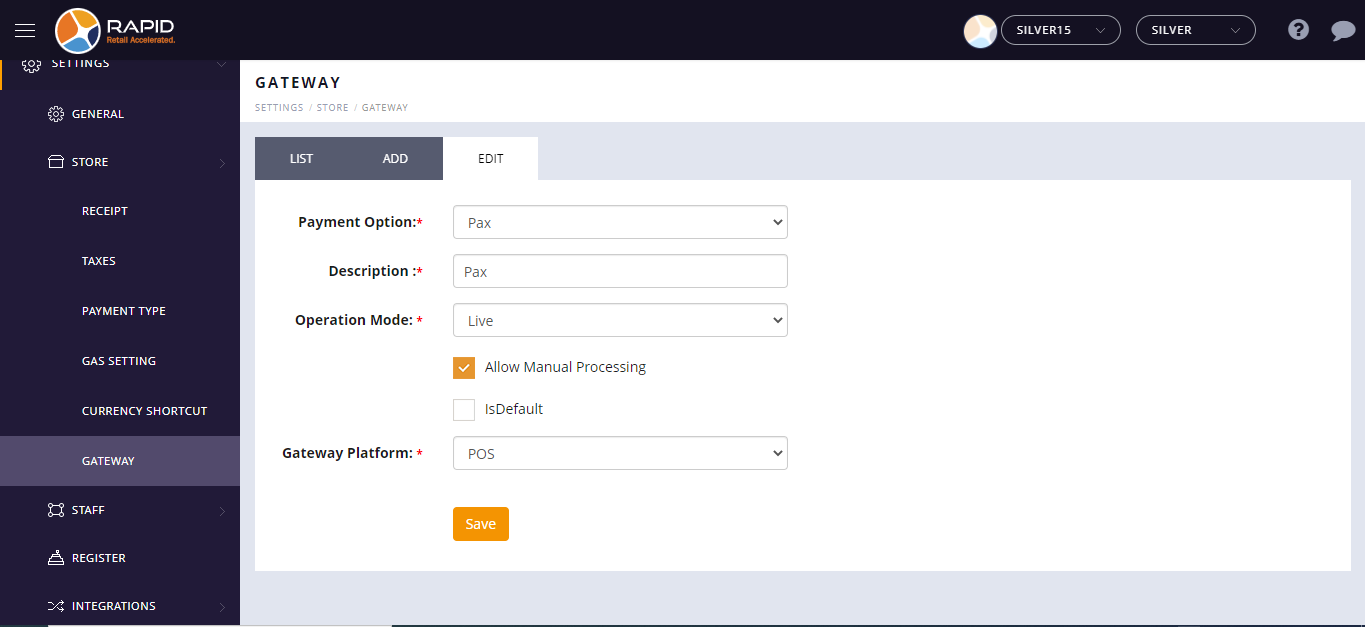 Fields Description Description Please enter the Payment gateway name. Gateway ID Please enter 23 for Gateway Id User name Please enter your store email Id into Username. Password Please enter your store password into Password. Operation Mode Select Live mode. Allow manual processing If you want to do the process manually while doing the payment process from your POS System, select Allow manual processing checkbox. IsDefault Select the Isdefault check box to use the payment gateway by default from your POS. Gateway Platform Select the Gateway platform on which platform you want to use the selected gateway.