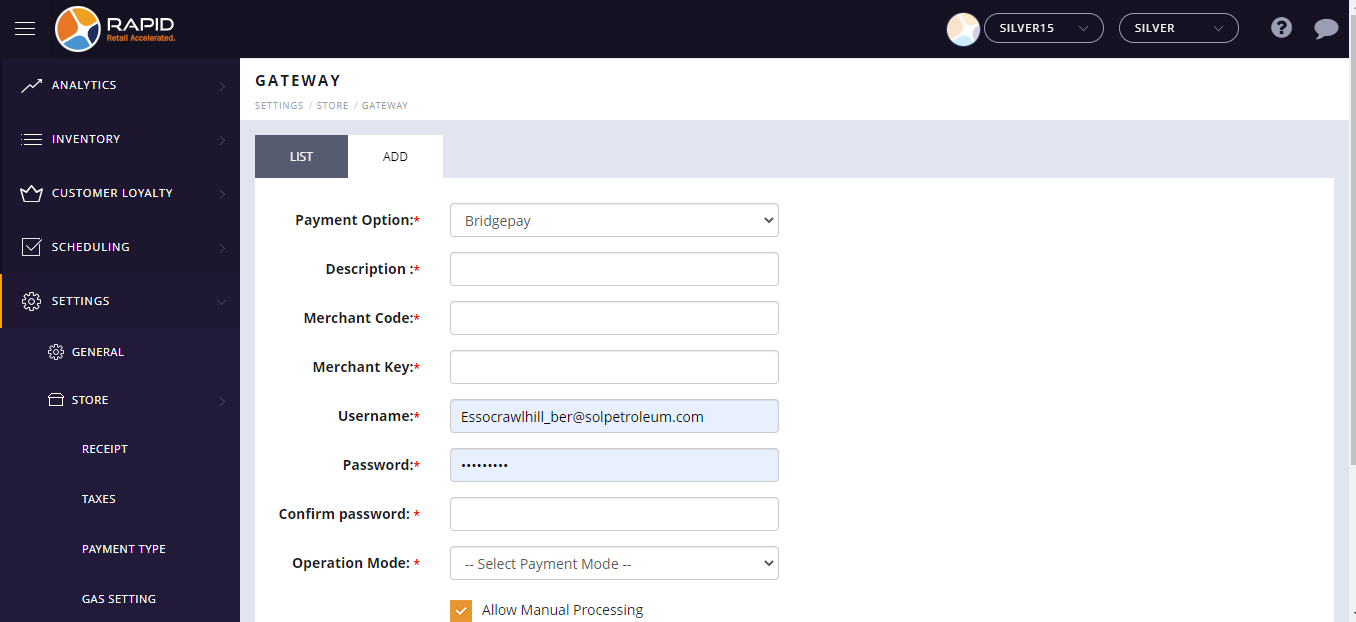 How to set up a Bridgepay gateway from Back office?
