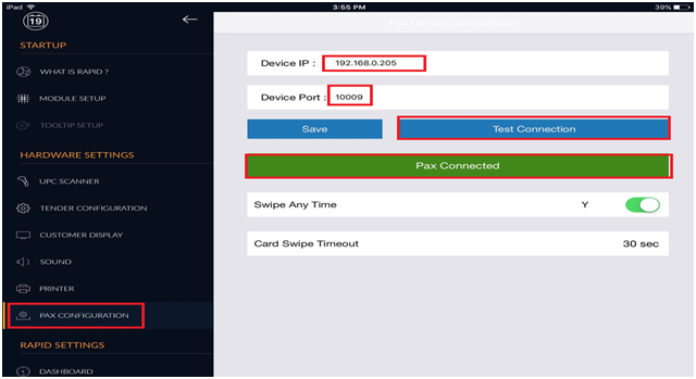 Pax device setup for taking credit card transaction in Rapid POS.