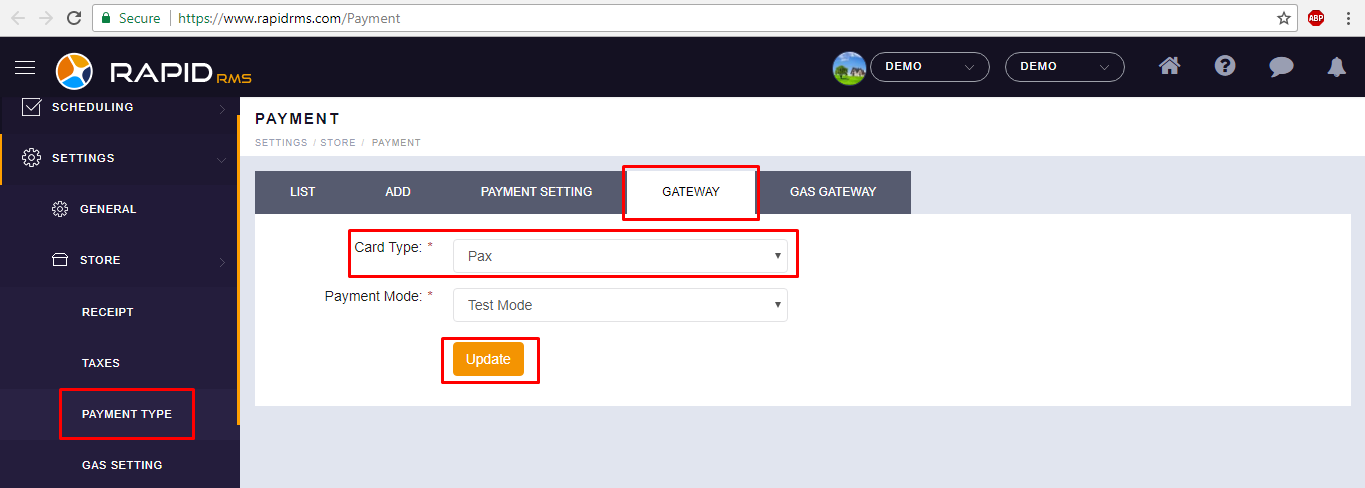 - Go to Settings > Store > Payment Type and click on Gateway in the top tabs.