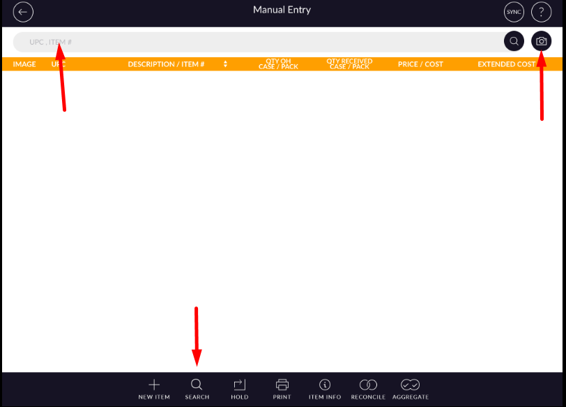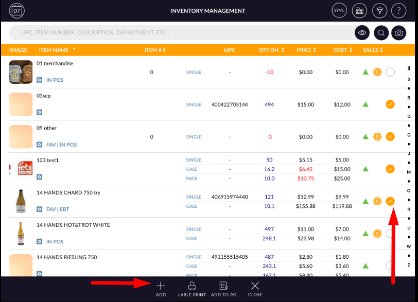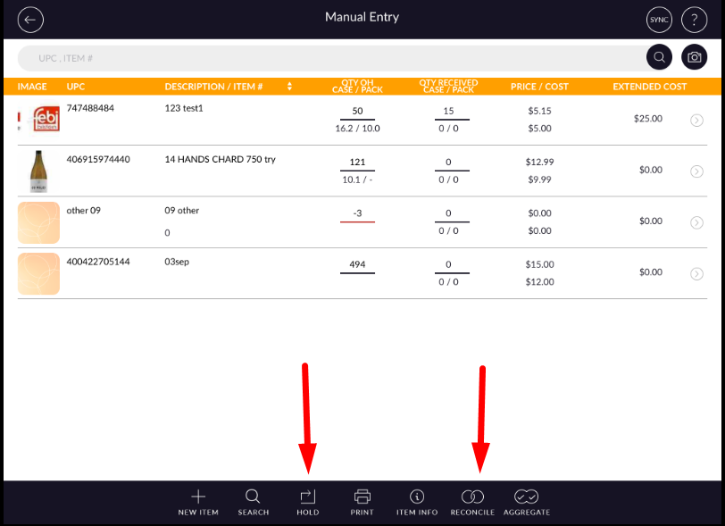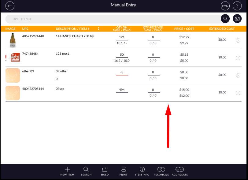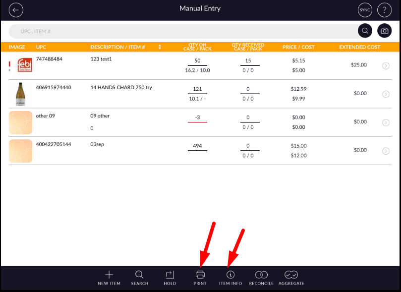 Selected items will display in the screen with Image, UPC, item name, Qty OH, Qty received, Cost and