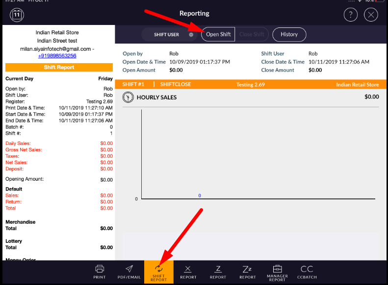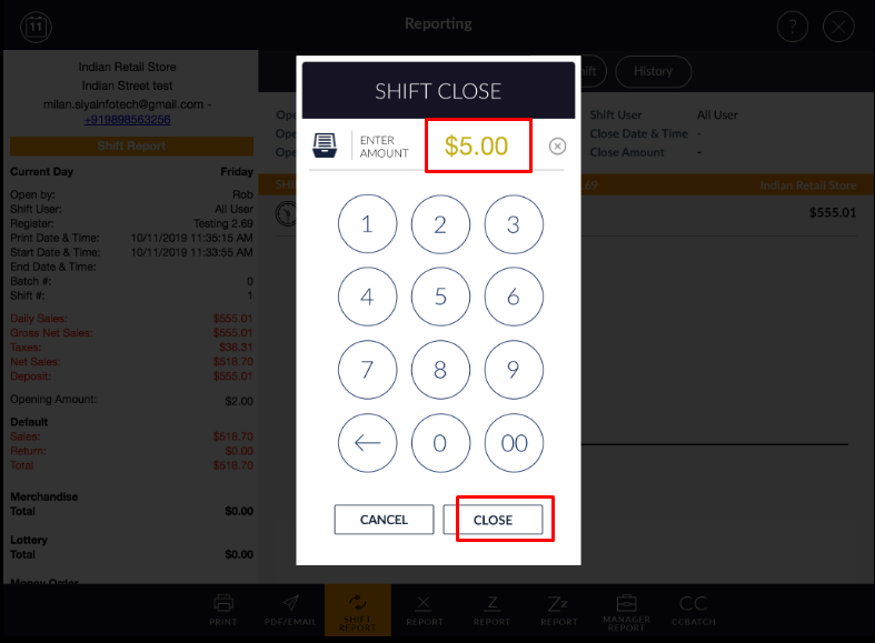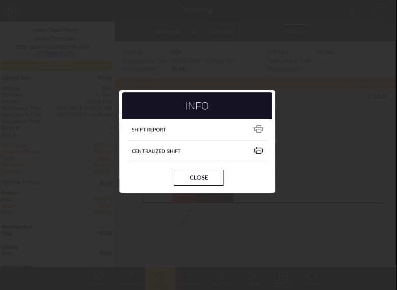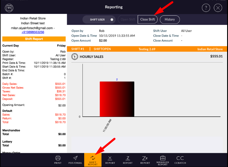 - When the shift is open then close shift option display enables. In shift all transaction data display.
