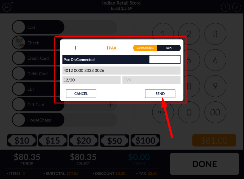 - Now direct punch credit card number which is on the credit/card number then click send button.