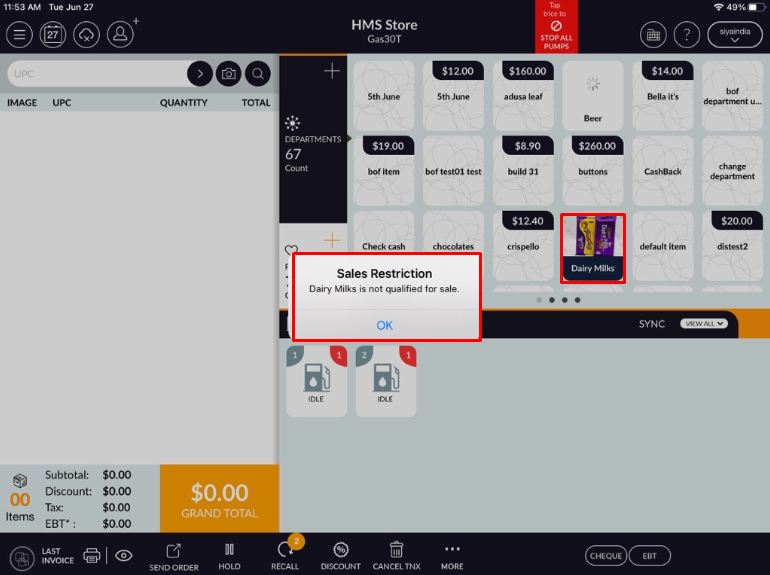 will get a popup message for Sales Restriction “Dairy Milks is not qualified for sale”.