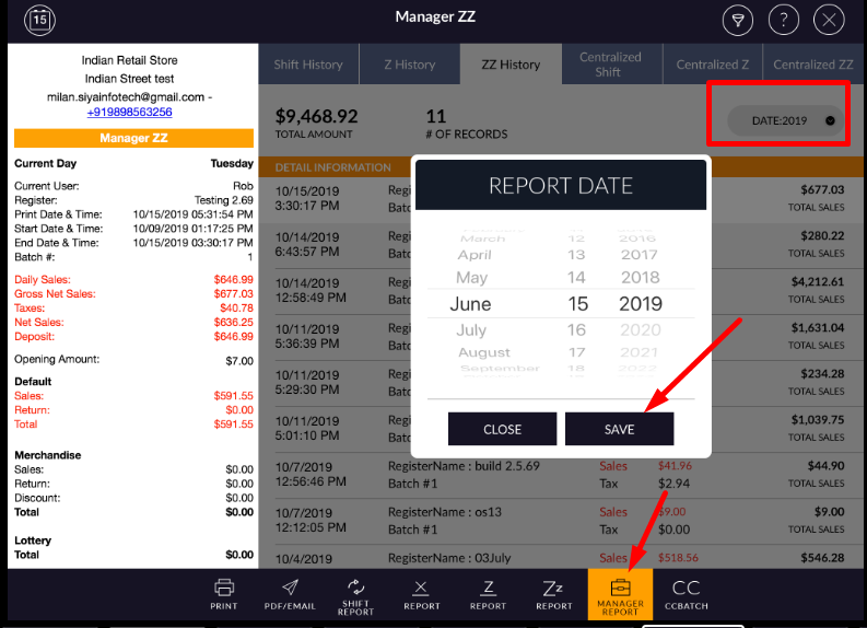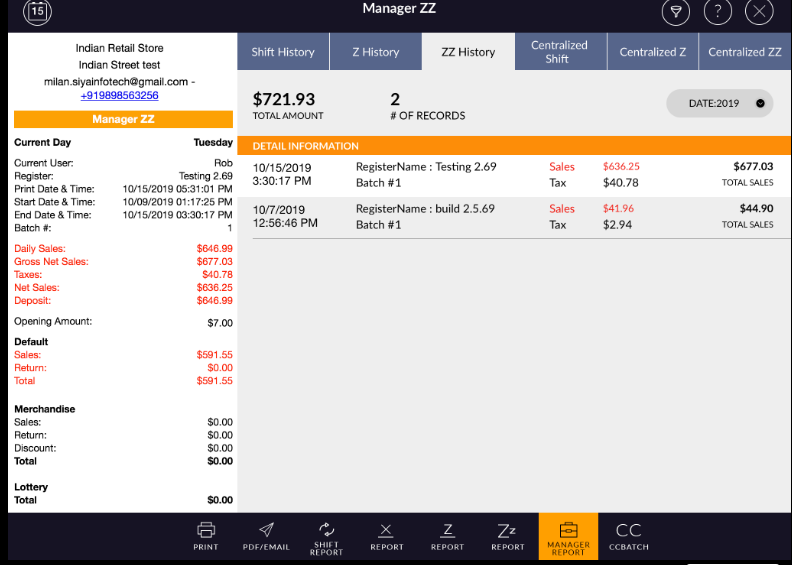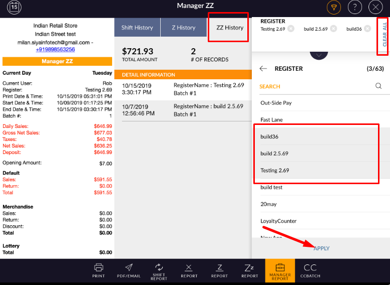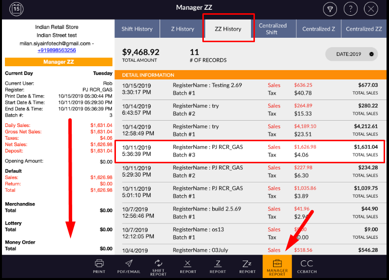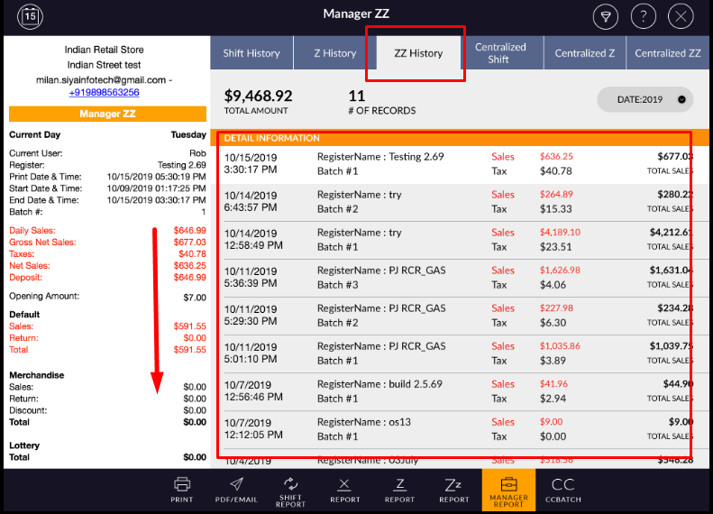 - In right-side, all Z are listed with ZZ applied to date, register name, batch #, Sales amount, tax