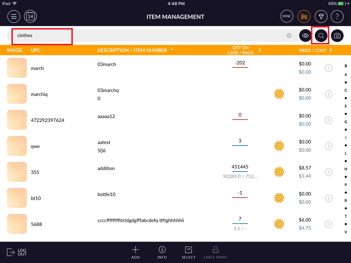 - In the item list, User can select either ABC shorting or keyboard option.