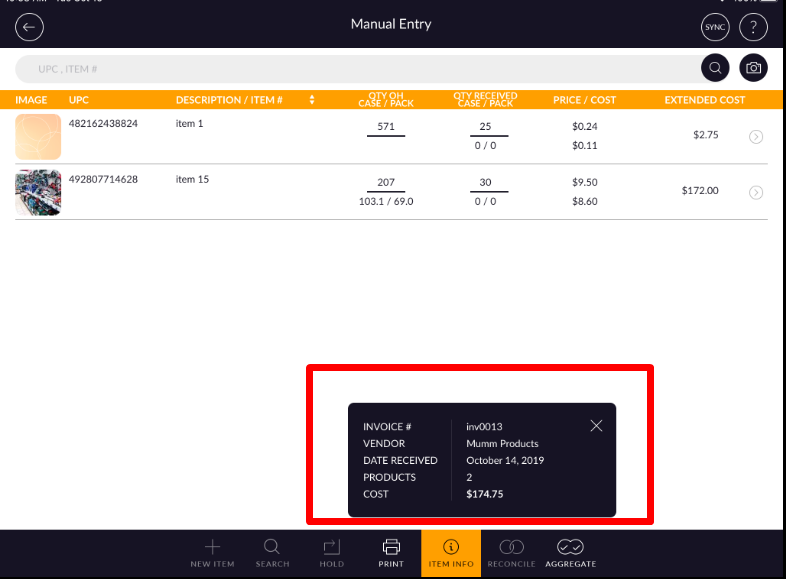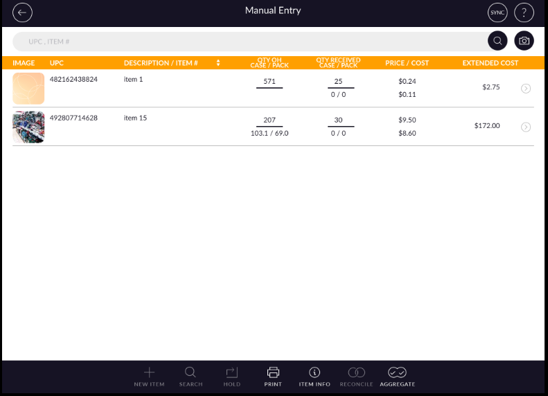 - Item display with UPC, description, and price/cost.