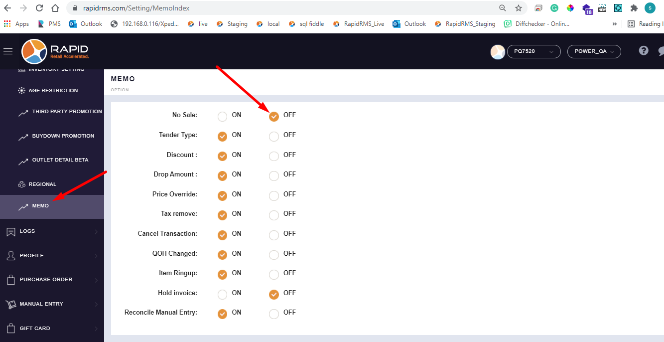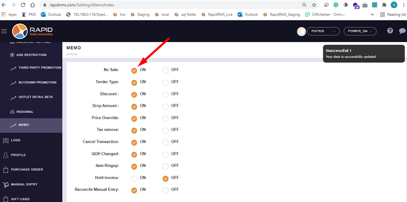 - Now from web log in keep memo option for no sales ON.