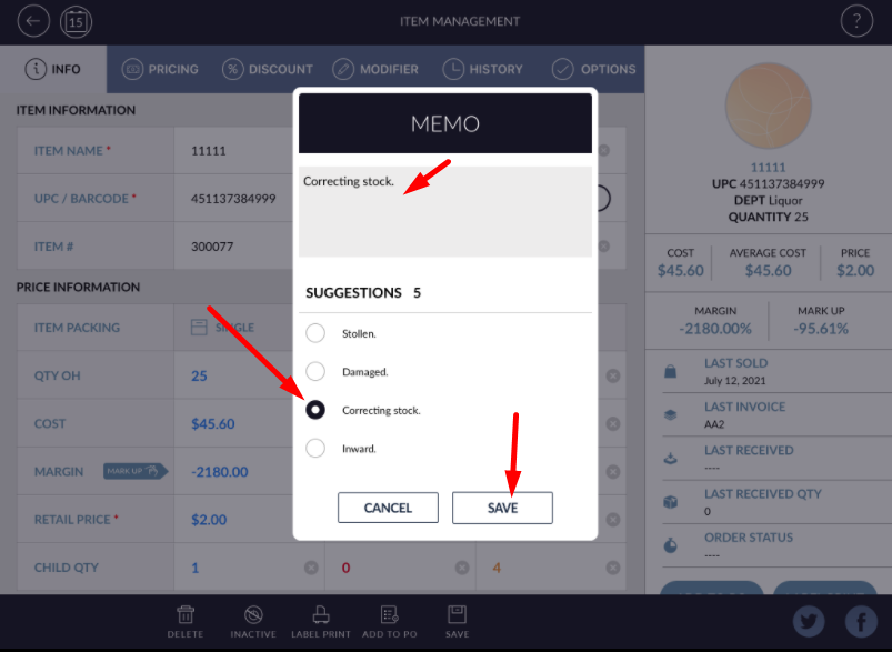 - When click on qty OH field then memo pop up for qty OH change reason would be open.